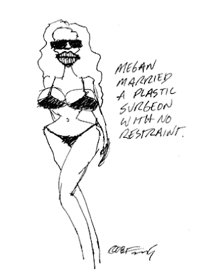 Rough of cartoon at top with final below. I removed a person to form a trio and changed "Fred" to "Mr. Witherspoon with his firm's new associates. And I made the "beach babe" into his "inner beach babe." Awkward.